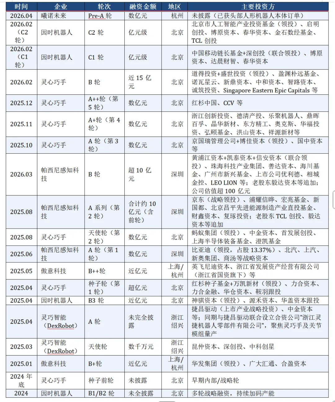 ·帕西尼(深圳)2025年A系列4个月内融资约10亿元,2026年3月再完成超10亿元B轮融资,估值超100亿元,累计吸引比亚迪、京东、黄浦江资本等14家顶级产业投资方。