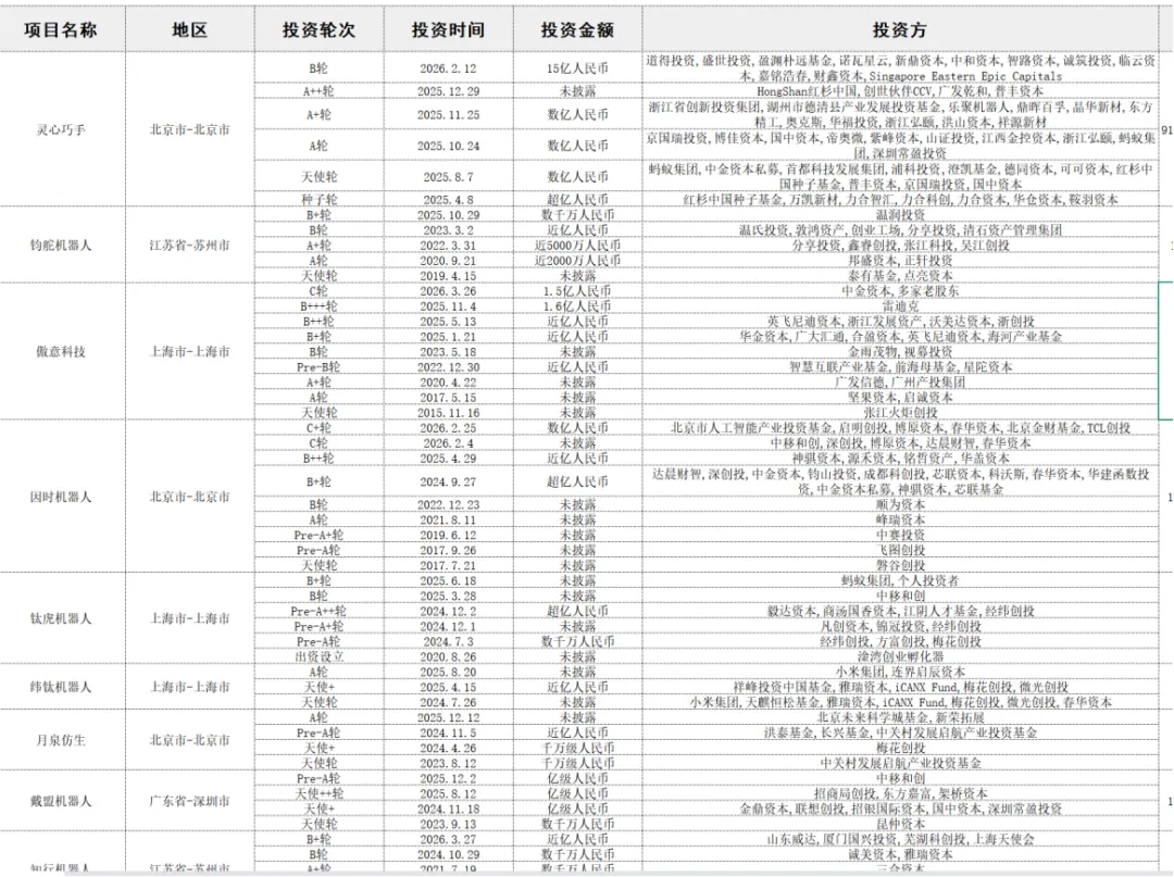 ·灵心巧手(北京)在2025年内完成5+轮融资,2026年2月B轮融资近15亿元,刷新行业单轮记录。