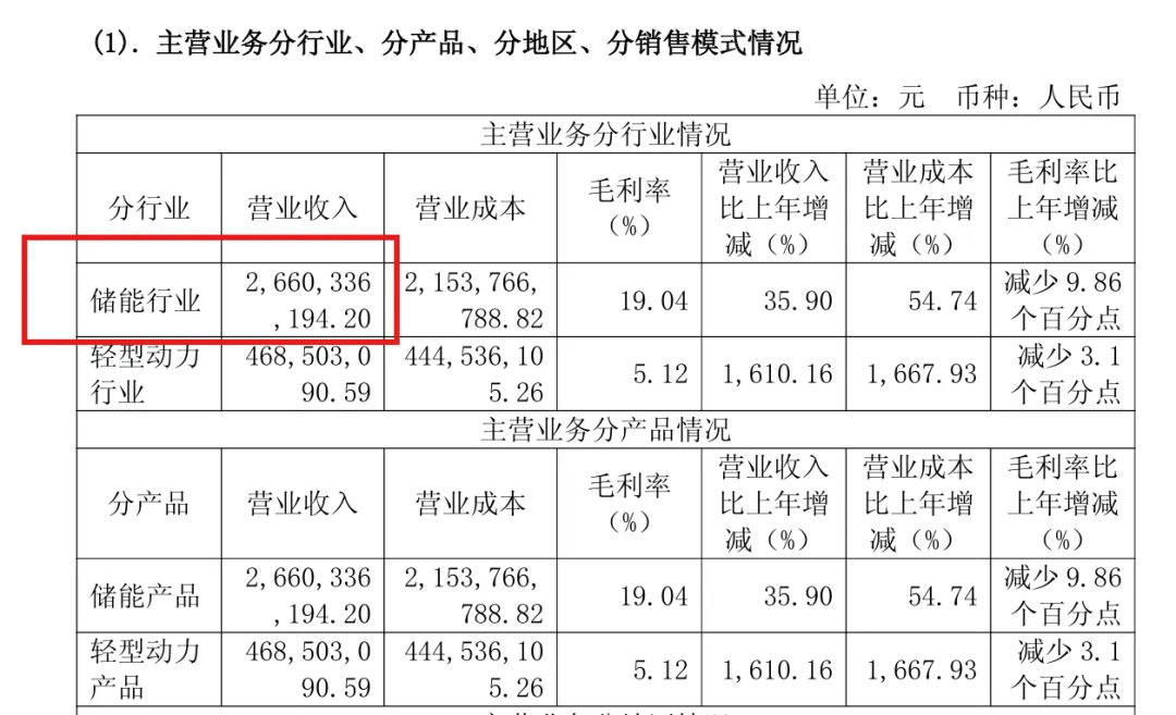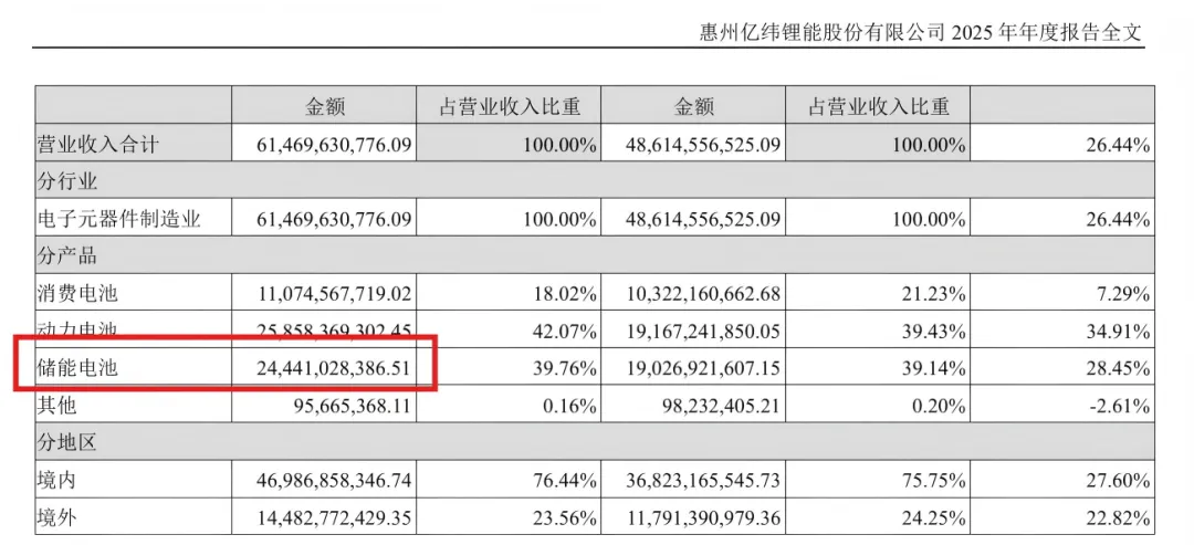 其中,储能电池2025年营收244.41亿元,营收规模同比增加28.45%,占总营收39.76%。