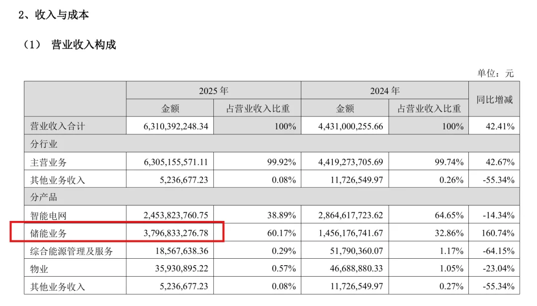 其中,储能业务2025年营收37.97亿元,营收规模同比增加160.74%,占总营收60.17%。