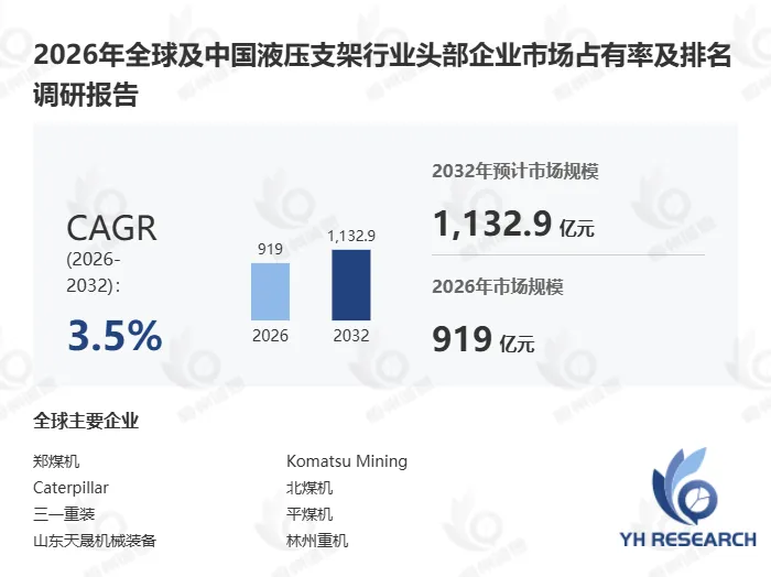 根据YH恒州诚思信息咨询调研统计,2025年全球液压支架市场规模约876.4亿元,预计未来将持续保持平稳增长的态势,到2032年市场规模将接近1132.9亿元,未来六年CAGR为3.5%。