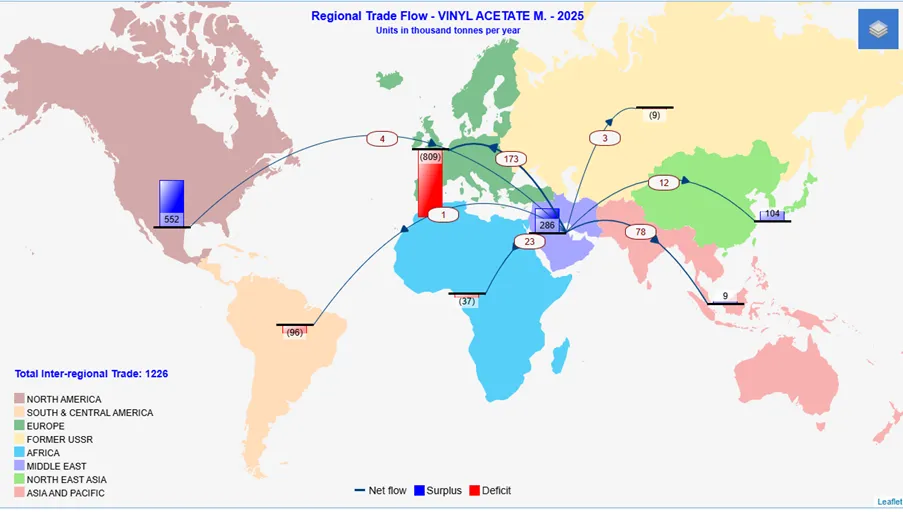 另一端,欧洲的走势先缓后疾。欧洲作为全球醋酸乙烯进口量最大的地区,2025年总计输入约80万吨,其中6成从美国进口,剩余货源多来自中东,以东北亚和亚太地区作为补充。