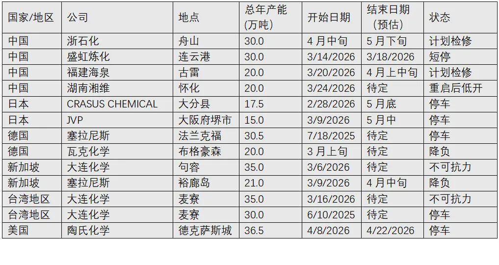 此外,包括韩国及台湾地区在内的多套亚洲醋酸乙烯装置也因原料问题而降负或停车。