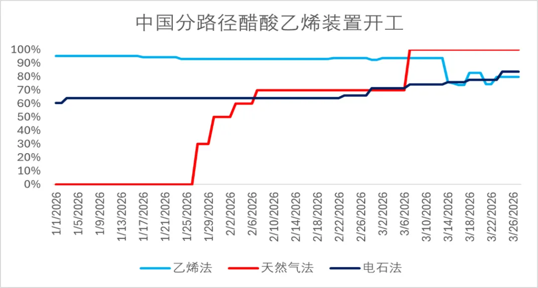 此外,中国醋酸乙烯产能中四成左右为电石法资源,如加上天然气法资源,合计占比高达56%。得益于原料端的多样性,近期国内醋酸乙烯行业开工稳定提升。据ICIS数据,3月底醋酸乙烯日度平均开工已超84%,相对2月初上涨约10个百分点。
