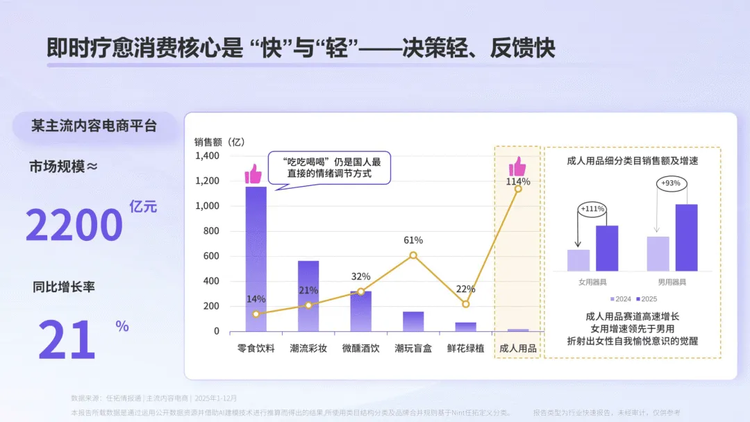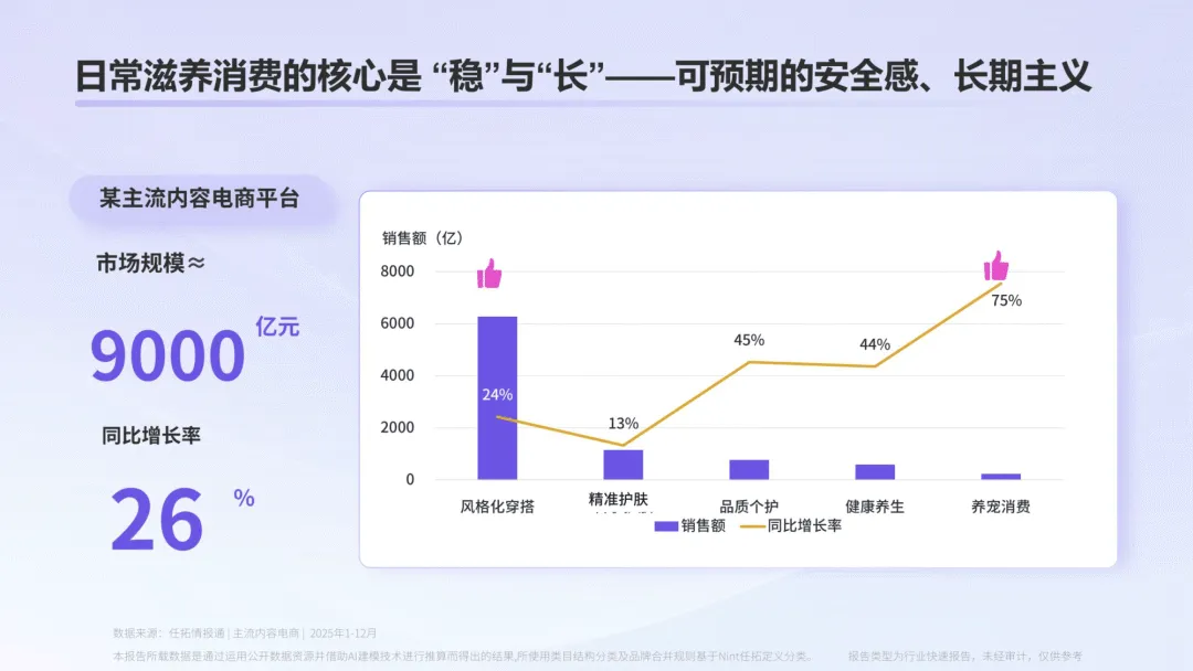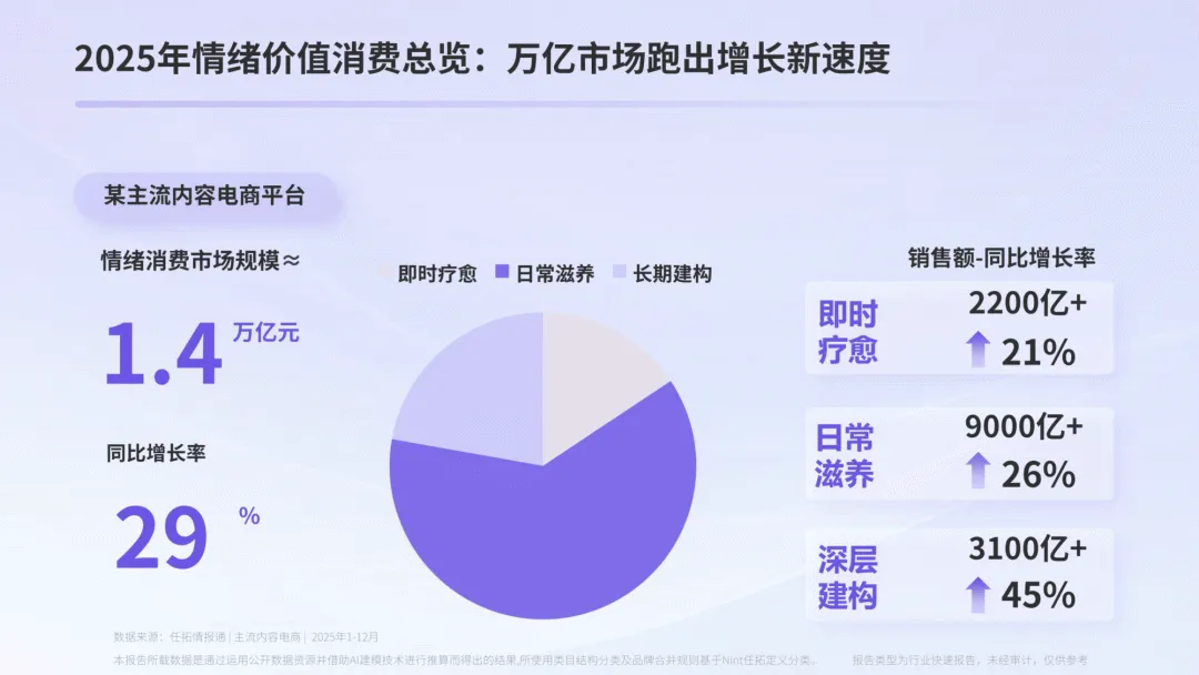 《2026 年情绪经济电商消费报告》指出,当下社会情绪内核转向 “向内求索”,情绪价值已从商品附加项成为消费决策核心,2025 年主流内容电商平台情绪消费市场规模达 1.4 万亿元,同比增长 29%,并形成即时疗愈、日常滋养、深度建构三大消费层级,各层级均展现出差异化的增长特征与消费趋势。
