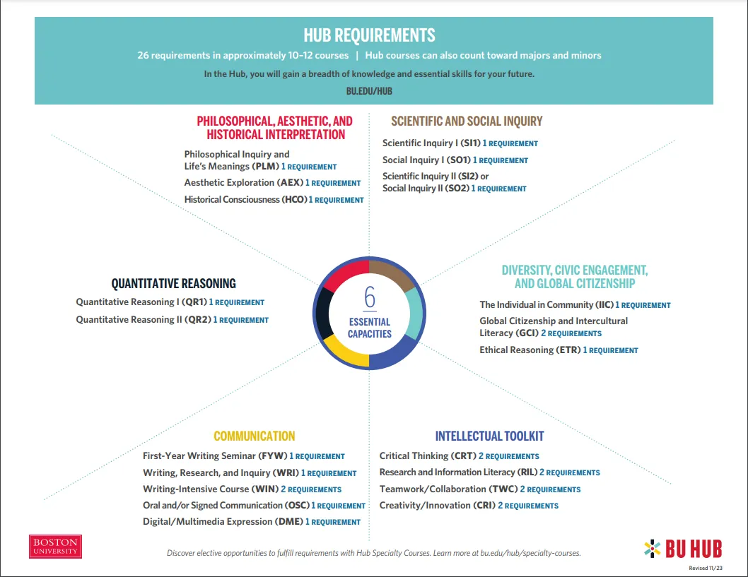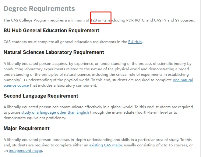 BU大部分专业是128 学分毕业,主要是由三部分构成: