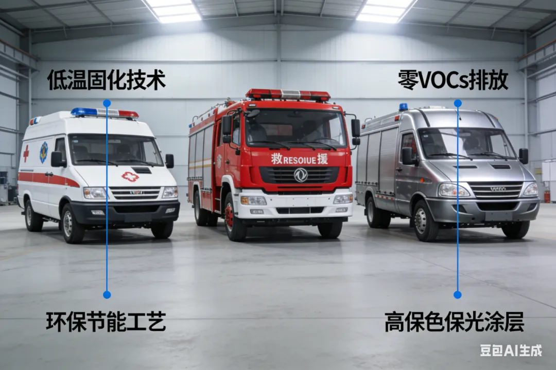 传统油性涂料污染环境且对喷涂人员带来健康危害,随着环保政策的实施,国内制造商开始采用粉末涂料喷涂。传统油性涂料涂装中会挥发有害的化学物质,常见有苯乙烯、甲苯、乙苯、甲醛等,这些化学物质大部分污染环境和危害人体健康。随着粉末涂料的应用,大幅度降低了有害化学物质的挥发。目前国内已实现粉末涂料的在热敏底材涂装上的低温固化涂装技术,并在专用车(救护车、消防车、机场用车等)上使用粉末涂料,专用车是汽车工业重要的组成部分。因专用车长时间在户外作业,要求涂层的保色性和保光性要高。所以采用低温固化的粉末涂料来达到低温固化和耐候性的要求。低温固化技术相较于高温固化技术则更加节能,通过提高树脂与固化剂的合理配比,可生产低温固化环氧粉末涂料,固化温度可降至110℃,并且实现零VOCs的排放。