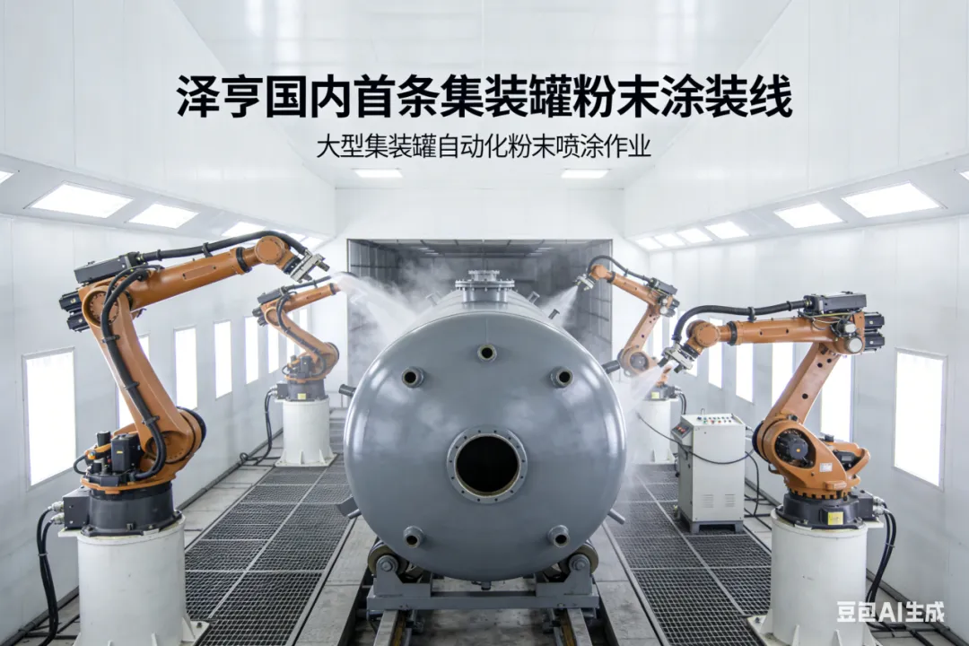 泽亨拥有国内首条集装罐粉末涂装线,验证了大型集装罐/集装箱“漆改粉”可行性,实现集装罐此种大型工件首次完全自动化喷涂。采用机器人定向喷涂端框或筒体,空喷率极低,粉末利用率最高。设计水平横向轴,将喷涂机器人安装在粉房内壁,大幅提高机器人的灵活性以及作业范围。内置式外置七轴机器人设计,可以降低喷房70%以上的开口面积,实现大幅降低风率节省能耗,缩短换色时间。定制开发旋转机构喷涂连接圈与端箱端面,科学配置喷枪对每个需求面做针对性喷涂,大幅提升自动化喷涂率。采用一体化的喷房设计,在封闭环境下喷涂,喷房抽风量需较小,设备能耗更低。