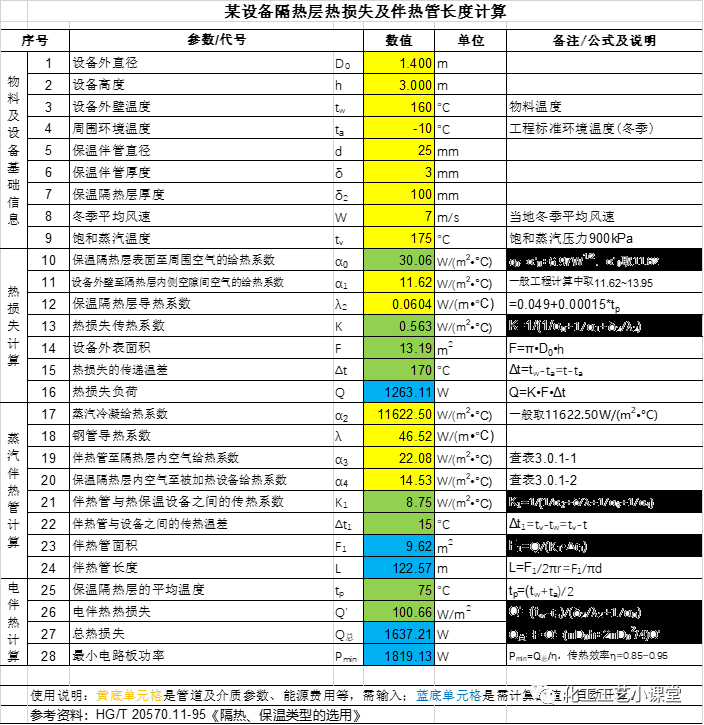 本计算书是小编参考相关资料编辑的,计算表中含详细的公式及参考图表,对计算设备伴热非常实用。如果你对该计算表格感兴趣,可联系管理员,发6.8红包即可获取。
