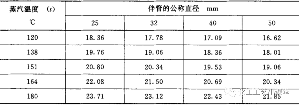 蒸汽伴管保温隔热层内空气的给热系数见下表,根据蒸汽温度和伴管直径选择给热系数。