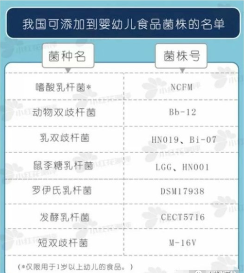 益生菌包含不同菌种,每个菌种下面又有不同菌株。根据国家卫生计生委发布的《可用于婴幼儿食品的菌种名单》,要求添加的益生菌要精准到菌株而不是菌种。经过安全性评估,只有以下菌株才可以添加到婴幼儿食品当中。
