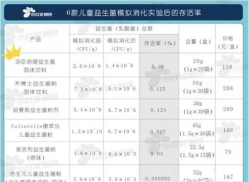 6款产品经过模拟消化实验后,益生菌存活率差距悬殊,最高的是最低的几万倍!