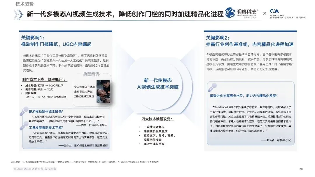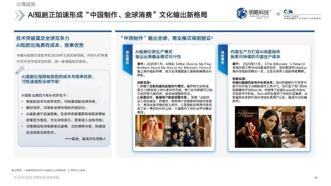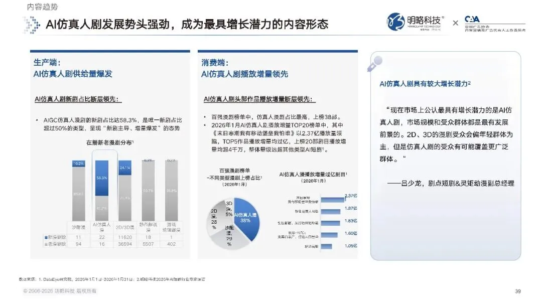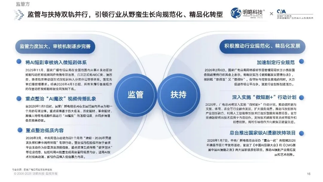 2026 年,微短剧及数字动漫相关领域,首次被写入国家五年规划纲要,政策层面明确了对新型文化业态的支持。一方面,监管部门持续开展专项治理,重点整治 AI 魔改视频、低质雷同内容等行业乱象,守住内容安全的底线;另一方面,官方也明确鼓励将 AI 技术应用于内容创作,深入实施微短剧 + 行动计划,还推出了国家级的 AI 漫剧扶持项目,推动行业在规范中实现创新发展。