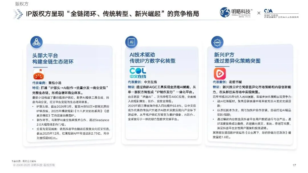 IP 版权方的市场格局,也在 AI 技术的加持下出现了新的变化。头部网文平台正在构建全链生态闭环,打通 IP 源头、AI 制作、流量分发、商业变现的完整体系,形成自循环的商业体系。截至 2026 年 3 月,头部平台已经开放了超 50 万部网文原创 IP 供 AI 短剧改编,从源头把控了内容供给的核心资源。