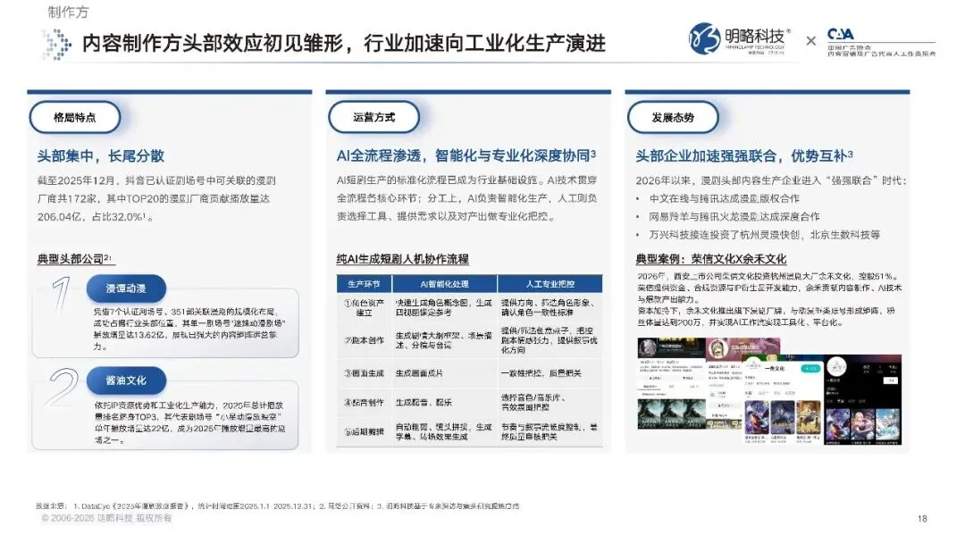 内容制作方的市场,头部效应已经初见雏形,行业正在加速向工业化生产演进。数据显示,截至 2025 年 12 月,抖音已认证的剧场号中,可关联的漫剧厂商共有 172 家,其中 TOP20 的漫剧厂商,贡献的播放量达到 206.04 亿,占总播放量的 32%。