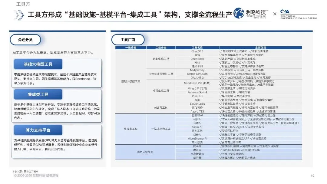 如今的工具市场,已经形成了清晰的三层架构。底层是基础大模型工具,掌握着多模态视频生成的核心技术,是整个行业的技术源头;中间层是集成类工具,基于基础大模型开发,深度适配短剧创作的业务场景,把复杂的创作过程拆解成标准化的操作流程,哪怕是没有专业背景的个人创作者,也能快速上手;最底层的算力支持平台,则通过弹性的 GPU 租赁服务,降低了创作者的硬件投入门槛。从剧本生成、角色场景设计,到视频生成、AI 配音、后期剪辑,内容创作的每一个环节,都有成熟的工具产品提供支撑,技术平权让内容创作的门槛降到了前所未有的高度。