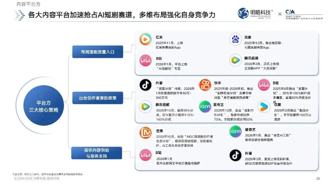 各大内容平台的密集布局,则成了行业爆发的催化剂。从 2025 年下半年开始,长短视频平台纷纷加码 AI 短剧赛道,扶持政策和激励计划密集出台。头部短视频平台把 AI 短剧的保底激励金额,从最高 120 万元大幅提升至 360 万元,激励力度直接翻了三倍,还在 2026 年 3 月官宣上线漫剧 IP 库,全面开放超 50 万部原创 IP 的合作。
