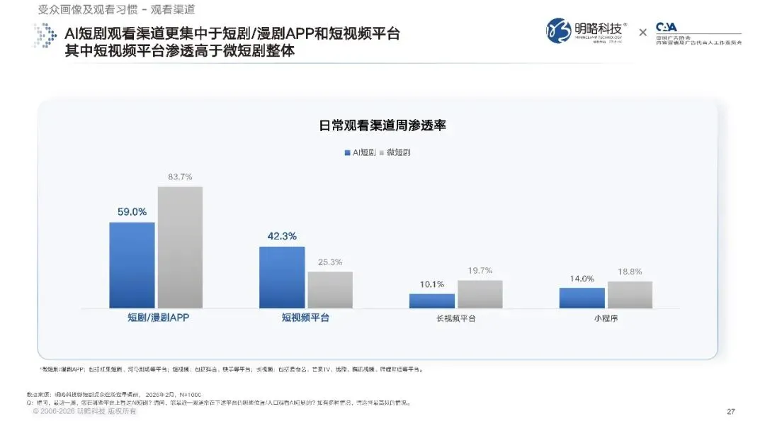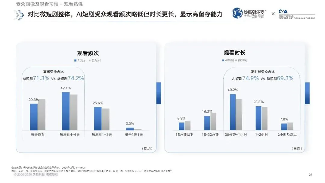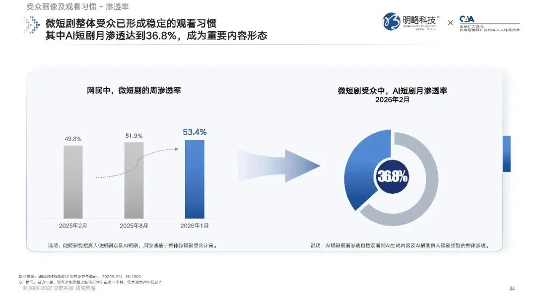 行业供给端的爆发,最终都要落到消费端的受众需求上。首先是渗透率的持续提升。数据显示,截至 2026 年 2 月,微短剧在网民中的周渗透率已经达到 53.4%,过半网民在最近一周里都有观看微短剧的行为,碎片化的观看习惯已经完全养成。而在微短剧的受众当中,AI 短剧的月渗透率达到了 36.8%,这意味着每三个看微短剧的人里,就有一个在最近一个月内观看过 AI 短剧,AI 短剧已经成为网络视听领域里,不可忽视的重要内容形态。