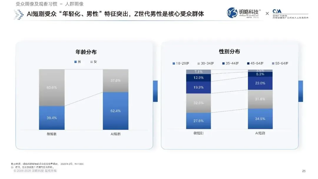 AI 短剧的受众画像,有着非常鲜明的特征,年轻化、男性化的标签格外突出。性别分布上,AI 短剧受众中,男性占比 62.4%,女性占比 37.6%,男性受众占据了绝对的主体地位。年龄分布上,18 到 29 岁的年轻群体,占比达到了 64.4%,其中 18 到 24 岁群体占比 31.8%,25 到 29 岁群体占比 32.6%,Z 世代男性,构成了 AI 短剧的核心受众群体。这样的受众结构,和整体微短剧市场形成了明显的差异,整体微短剧的受众男女比例更为均衡,年龄分布也更加宽泛,这也决定了 AI 短剧和真人短剧在内容题材上的不同走向。