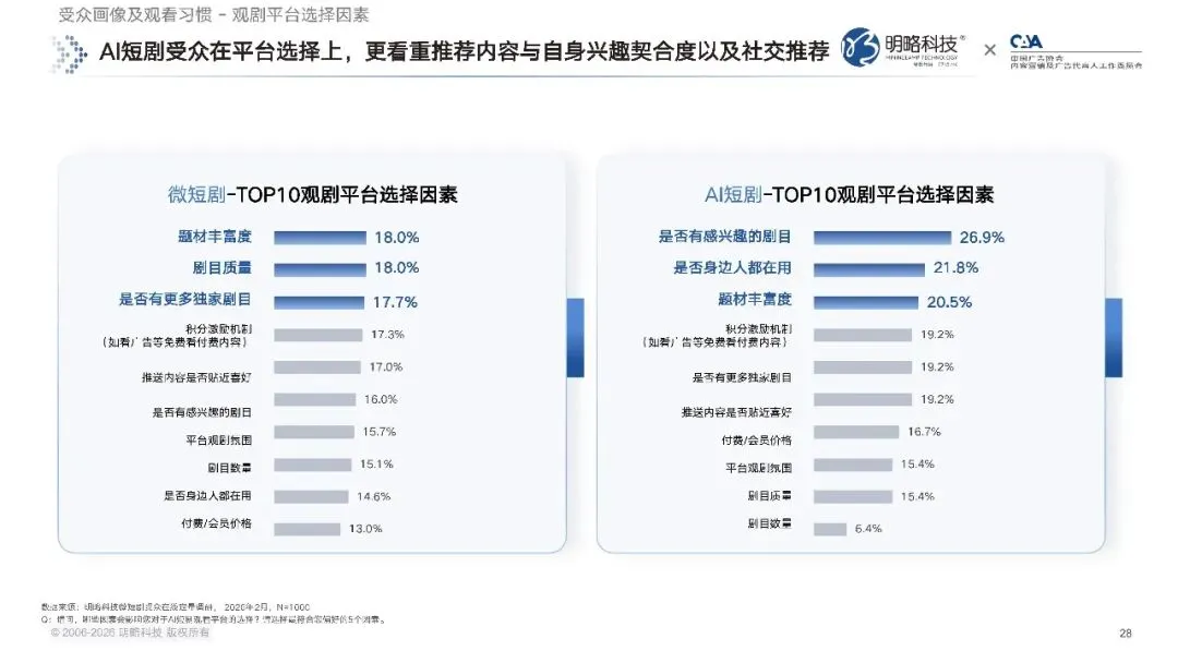 观看渠道上,AI 短剧受众的观看渠道更为集中。短剧与漫剧独立 APP 的周渗透率达到 83.7%,短视频平台的周渗透率为 59.0%,这两个渠道构成了观众观看 AI 短剧的绝对主流。尤其是短视频平台,AI 短剧的渗透率明显高于整体微短剧,这和平台的流量扶持与内容推荐策略密不可分。而观众在选择观看平台时,最看重的因素,是平台推荐的内容与自身兴趣的契合度,其次是身边人的使用情况,之后才是题材丰富度、剧目质量、独家内容数量等因素。这也说明,除了算法推荐的精准度,社交裂变带来的口碑传播,在 AI 短剧的用户获取上,也起到了至关重要的作用。