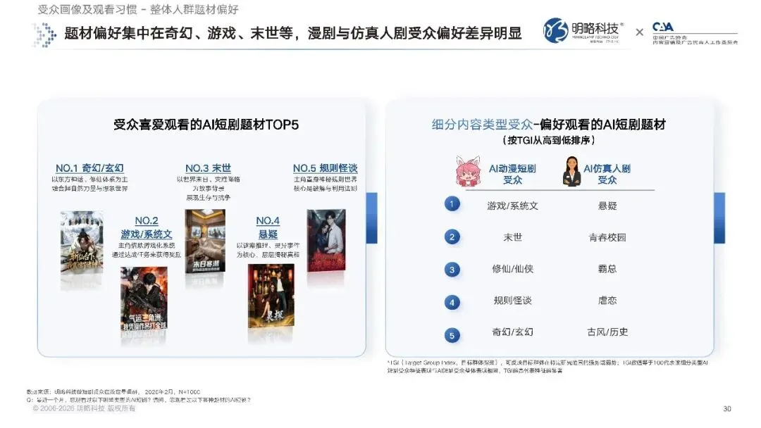 题材选择上,受众最喜爱的 AI 短剧题材 TOP5,分别是奇幻玄幻、游戏系统文、末世、悬疑、规则怪谈。以东方神话、修仙体系为主的奇幻玄幻题材,是当之无愧的市场顶流,游戏系统文、末世生存、悬疑推理、规则怪谈这类强设定、高想象力的题材,也都排在受众偏好的前列,而这些题材,恰恰都是 AI 短剧相较于真人短剧,最具竞争优势的领域。