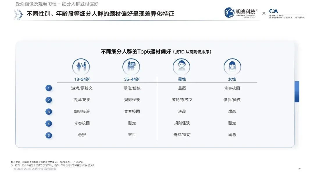 年龄层面,18 到 34 岁的年轻群体,对游戏系统文题材的偏好度最高,35 到 44 岁的中年群体,则更偏爱修仙仙侠题材。即便是同为 AI 短剧,AI 动漫短剧和 AI 仿真人剧的受众,题材偏好也截然不同,AI 动漫短剧的受众更关注游戏系统文、末世、规则怪谈,AI 仿真人剧的受众则更偏爱悬疑、霸总、青春校园这类更贴近真人短剧的内容。这些差异化的偏好,为内容创作者提供了清晰的创作方向,也让 AI 短剧的内容供给,能实现更精准的受众触达。