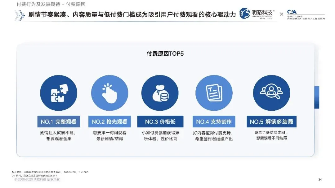 观众愿意为 AI 短剧付费的核心驱动力,始终围绕内容本身展开。付费原因排在前五位的,分别是剧情让人欲罢不能,想要完整观看全集;想要第一时间抢先观看最新剧情与结局;小额付费就能获得娱乐体验,性价比高;好内容值得付费支持,希望创作者持续产出;剧集设置了多结局走向,想要解锁不同的内容。可以看出,紧凑的剧情节奏、强吸引力的故事内容,是驱动用户付费的核心因素,而低付费门槛,则进一步降低了用户的付费决策成本,让商业变现的闭环更加顺畅。