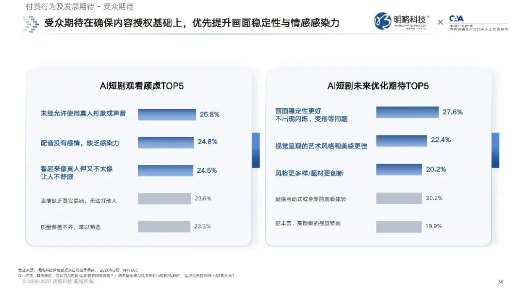 最难以接受的,则是由 AI 完成角色演绎,以及 AI 创作配乐与音效、AI 进行角色设计。观众在观看 AI 短剧时,最大的顾虑,排在首位的是未经允许使用真人形象或声音,然后是配音没有感情、缺乏感染力,画面人物似真非真带来的不适感,表演缺乏真实情感,以及内容质量参差不齐难以筛选。与之对应的,观众最希望 AI 短剧优先优化的方向,首先是提升画面稳定性,避免出现闪烁、变形等问题,其次是提升视觉呈现的艺术风格与美感,还有题材与风格的多样化创新,互动式的观看体验,以及更丰富高质量的视觉特效。