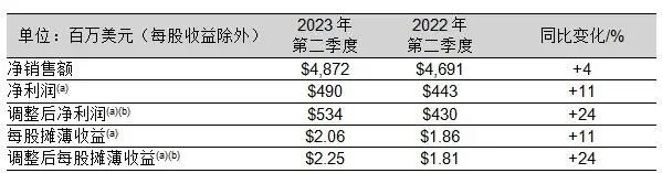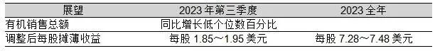 2023年第三季度的有效税率预计在23%~24%,高于 2022 年第三季度,主要原因在于上年的非经常性离散税项。有效税率上涨预计将对2023年第三季度的调整后每股摊薄收益产生不利影响,影响幅度约为0.07~0.09美元。