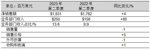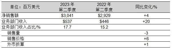 与上年相比,工业领域涂料业务部门的收入增长了9400万美元,增长率达60%,主要原因在于销售价格上涨和原材料成本增长放缓。与2022年第二季度相比,该业务部门的利润率提高了470个基点。