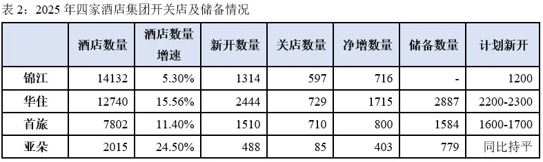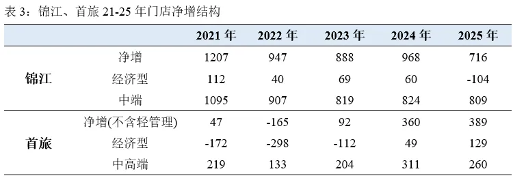 从几家集团开店计划看,华住、亚朵、首旅26年都将维持较高开店节奏(表3),锦江降速,原因一方面海外亏损拖累财务(25年亏损6.66亿,相比24年的4.37亿加深),另一方面更重要,即前期虽通过并购快速扩张,但并未像华住那样形成聚焦的产品,导致品牌分散,在当前投资人更理性看品牌和投资回报率的阶段,品牌势能不够不仅难以扩张,还面临关闭低效门店的压力,这也是锦江和首旅关店比例明显高于华住和亚朵的原因。不过对于锦江而言,虽然整体开店节奏放缓,但结构上看不弱,如表3,其25年门店整体净增716家,其中经济型净减少104家,而中端酒店净增809家,并未降速,因此,能够判断其开店和扩张节奏放缓主要为调整品牌势能低的门店、尤其是经济型酒店,体现在业绩端,其国内酒店业务收入同比+1.94%、归母净利润同比+23.5%(有直营改善、财务费用优化等原因),显著好于首旅的收入同比-1.9%、归母净利润同比+1.1%(扣非、有景区贡献)。