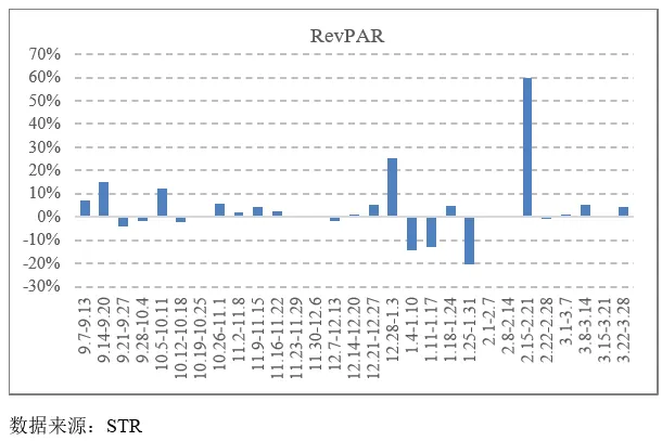 根据酒店之家数据,春节当月四周(2.2-3.1)国内酒店平均RevPAR同比+10.8%,其中ADR同比+7.3%,OCC同比+1.8pct;而3月延续了景气度,3月四周RevPAR同样都录得正增长,如下图。