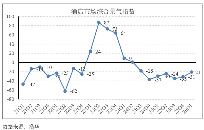 浩华跟踪的酒店市场综合景气指数显示,26Q1全国酒店市场综合景⽓指数为-21,较25Q4回升10个指数点,为近6个季度以来最高,并且环比提升幅度明显,反映从业者对短期经营环境的预期较上⼀季度改善。