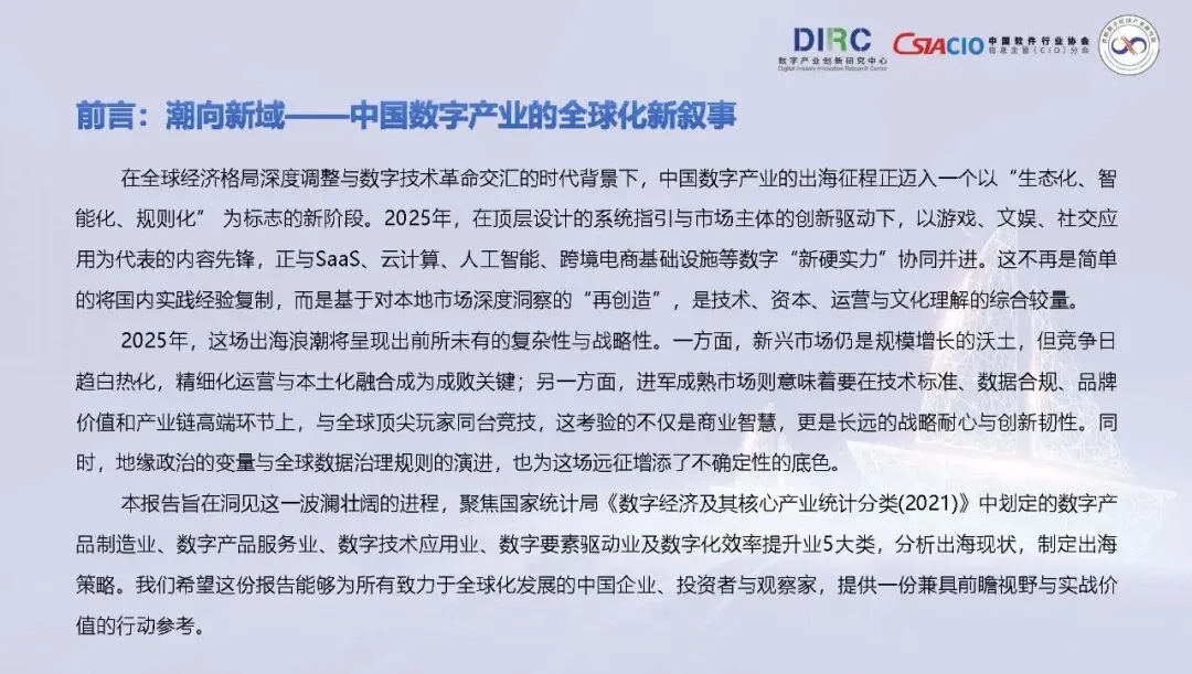 在全球经济格局深度调整与数字技术革命交汇的时代背景下,中国数字产业的出海征程正迈入一个以“生态化、智能化、规则化” 为标志的新阶段。2025年,在顶层设计的系统指引与市场主体的创新驱动下,以游戏、文娱、社交应用为代表的内容先锋,正与SaaS、云计算、人工智能、跨境电商基础设施等数字“新硬实力”协同并进。