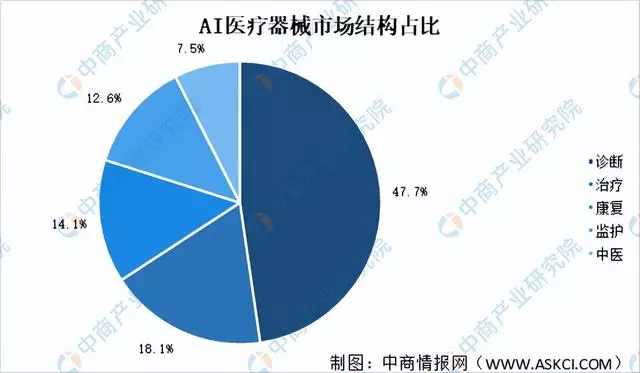 早在2017年,国家颁布《新一代人工智能发展规划》标志着人工智能的应用正式上升到国家层面。随着我国政策的大力支持,人工智能(AI)在医疗领域已经开始发挥越来越重要的作用,2022年全球市场规模为7.21亿美元,预计在今年将达到16亿美元。人工智能在医疗器械市场表现尤为突出,而诊断领域是最大的细分市场,占比47.7%。
