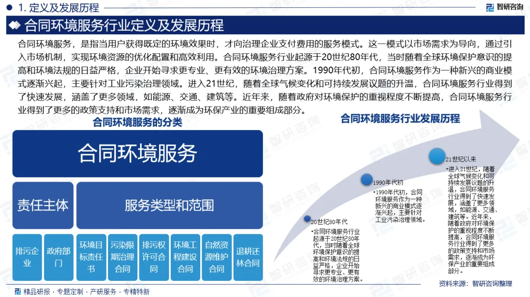 行业发展阶段:合同环境服务行业起源于20世纪80年代,当时随着全球环境保护意识的提高和环境法规的日益严格,企业开始寻求更专业、更有效的环境治理方案。1990年代初,合同环境服务作为一种新兴的商业模式逐渐兴起,主要针对工业污染治理领域。进入21世纪,随着全球气候变化和可持续发展议题的升温,合同环境服务行业得到了快速发展,涵盖了更多领域,如能源、交通、建筑等。近年来,随着政府对环境保护的重视程度不断提高,合同环境服务行业得到了更多的政策支持和市场需求,逐渐成为环保产业的重要组成部分。