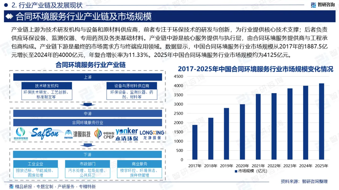 产业链核心节点:合同环境服务产业链主要包括技术研发机构、设备和原材料供应商、合同环境服务提供商、工程承包商、工业企业、市政部门以及商业和服务业等多个环节。这些环节相互协作,共同推动合同环境服务行业的发展。产业链上游为技术研发机构与设备和原材料供应商,前者专注于环保技术的研发与创新,为行业提供核心技术支撑;后者负责供应环保设备、监测仪器、专用药剂及各类基础材料。产业链中游是核心服务提供与执行层,由合同环境服务提供商与工程承包商构成。产业链下游是最终的市场需求方与终端应用领域,主要包括作为主要客户的工业企业(需实现达标排放与节能降耗)、承担公共管理职能的市政部门(需处理城市污水、垃圾等),以及追求良好经营环境的商业服务业(如商场、酒店与写字楼等)。各环节相互依存、协作共生,共同推动整个行业的持续发展。