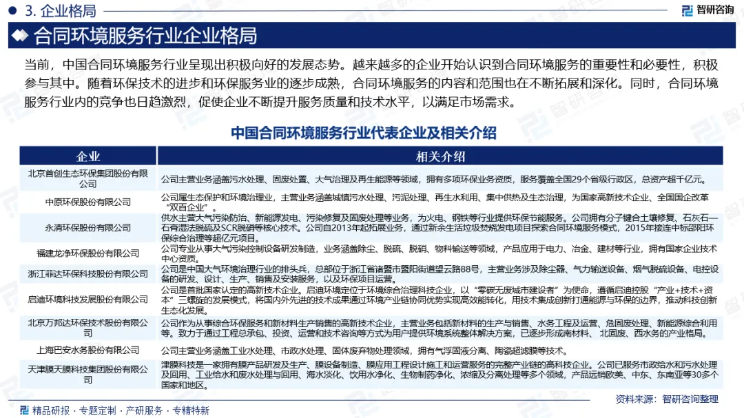 企业格局:当前,中国合同环境服务行业呈现出积极向好的发展态势。越来越多的企业开始认识到合同环境服务的重要性和必要性,积极参与其中。随着环保技术的进步和环保服务业的逐步成熟,合同环境服务的内容和范围也在不断拓展和深化。同时,合同环境服务行业内的竞争也日趋激烈,促使企业不断提升服务质量和技术水平,以满足市场需求。目前,中国合同环境服务行业代表企业包括北京首创生态环保集团股份有限公司、中原环保股份有限公司、永清环保股份有限公司、福建龙净环保股份有限公司、浙江菲达环保科技股份有限公司、启迪环境科技发展股份有限公司、北京万邦达环保技术股份有限公司、上海巴安水务股份有限公司、天津膜天膜科技集团股份有限公司等。