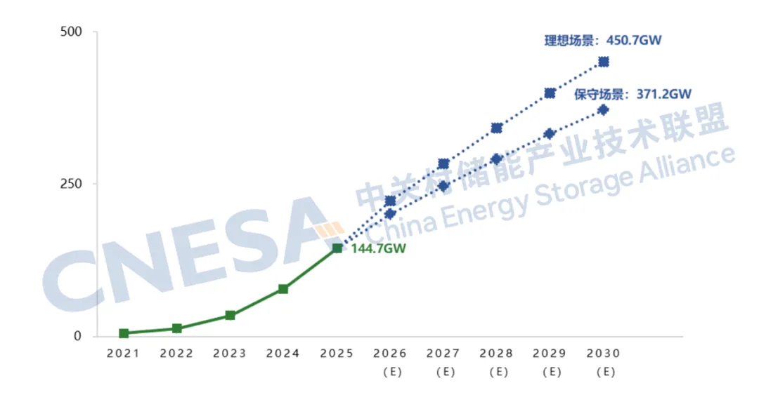 理想场景下,预计2030年新型储能累计规模将达到450.7GW,2026-2030年复合年均增长率(CAGR)为25.5%。