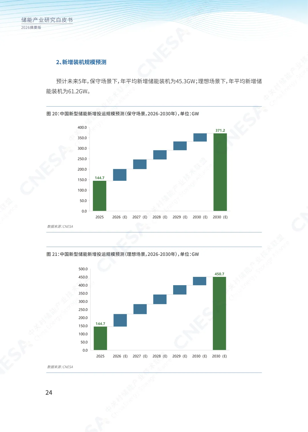 此次发布的白皮书中,CNESA结合保守场景1与理想场景2,对 2026-2030 年中国新型储能市场规模的预测如下: