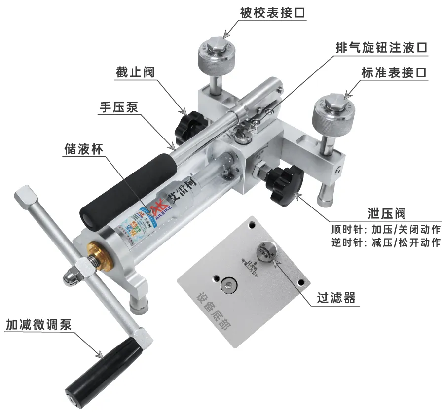 储液与过滤系统:内置大容量储液杯,满足长时间连续校准需求;底部配备精密过滤器,可有效过滤介质中的杂质,避免油路堵塞与密封件磨损,延长设备使用寿命。