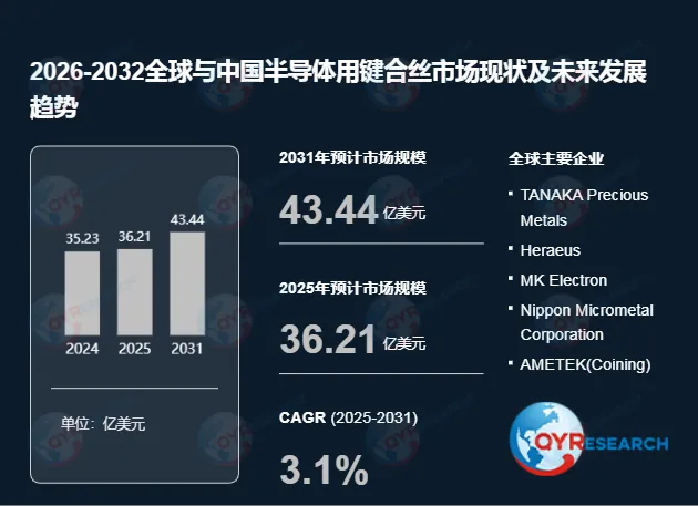根据QYR(恒州博智)的统计及预测,2025年全球半导体用键合丝市场销售额达到了36.21亿美元,预计2031年将达到43.44亿美元,年复合增长率(CAGR)为3.1%(2025-2031)。
