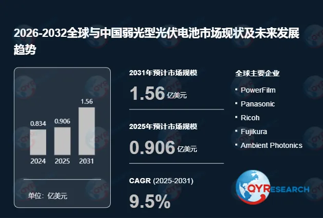 根据QYR(恒州博智)的统计及预测,2025年全球弱光型光伏电池市场销售额达到了0.91亿美元,预计2031年将达到1.56亿美元,年复合增长率(CAGR)为9.5%(2025-2031)。