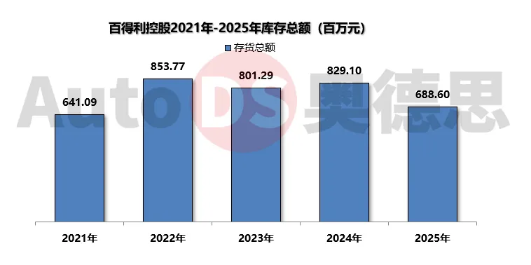 百得利控股存货包括汽车、零件及配件。存货为688.60百万元,较去年同期下降16.9%。主要是由于本集团实行更严格及高效的存货管理。