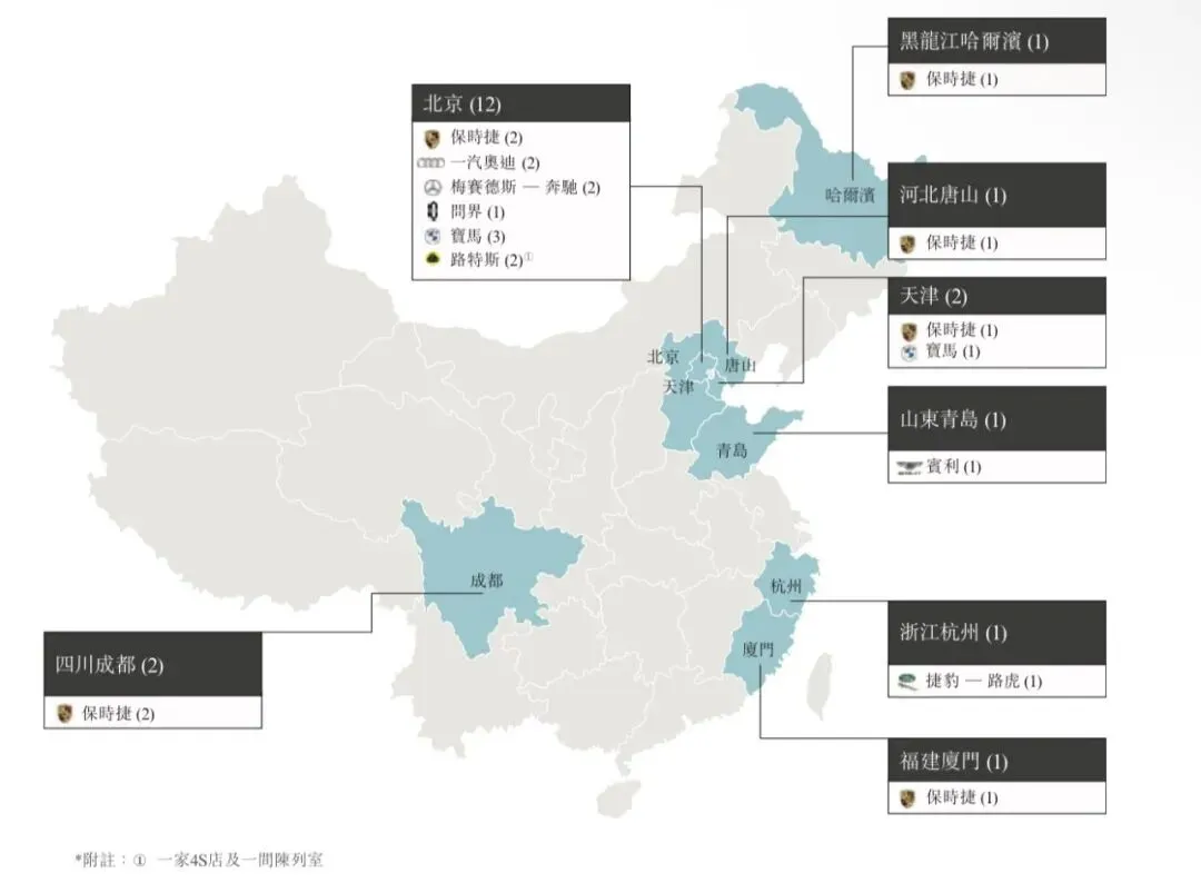 所有门店均位于中国经济发达地区的富裕城市及热点城市商业区附近,如北京、天津、杭州、成都、青岛、唐山、哈尔滨及厦门。