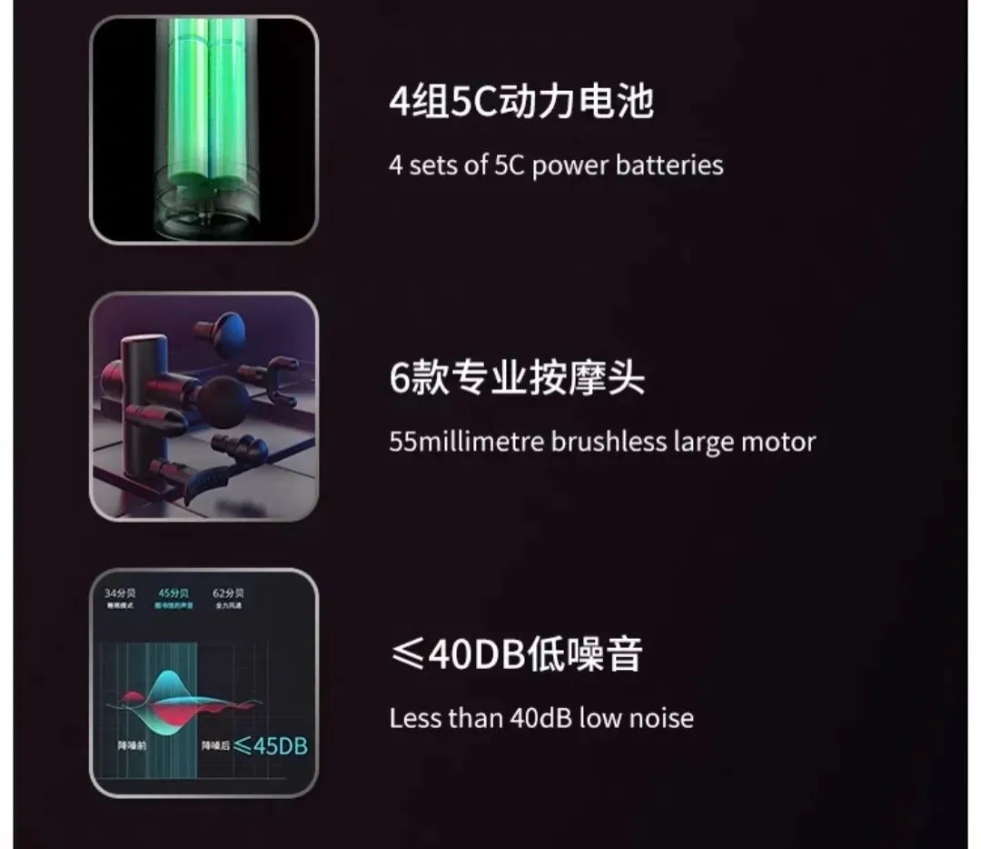 搭载高效无刷电机,运行稳定,噪音控制在48分贝以内,配备5款多功能按摩头,支持22档力度调节,机身采用人体工学设计,握持舒适,兼顾办公、健身两大场景,耐用性强。