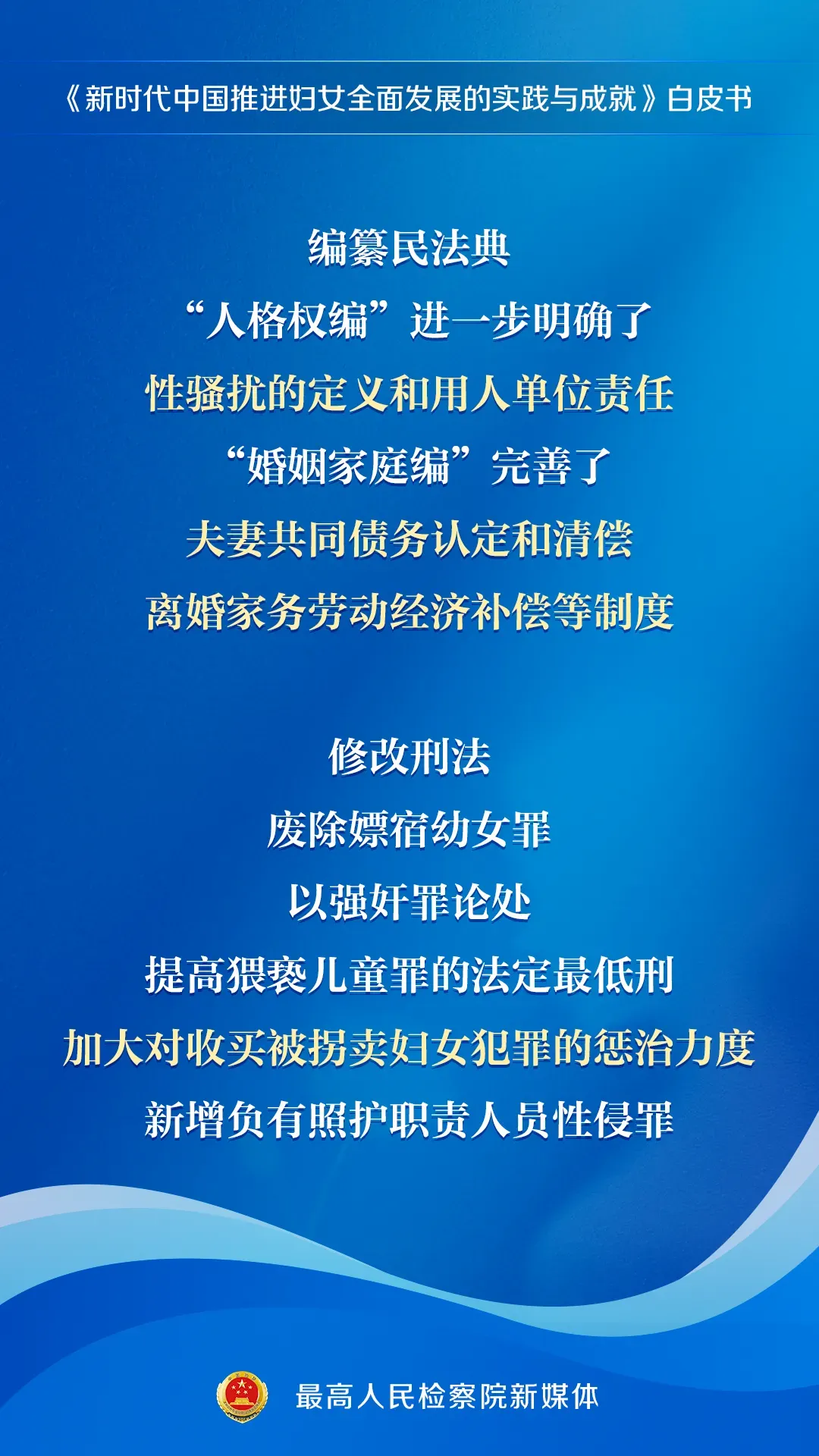 妇女是人类文明的开创者、社会进步的推动者。保障妇女权益是全社会的共同责任,也是检察机关义不容辞的政治责任和法治担当。近日,国务院新闻办公室发布《新时代中国推进妇女全面发展的实践与成就》白皮书,其中系统展示了对妇女权益的法治保障与检察守护。一起来划重点!
