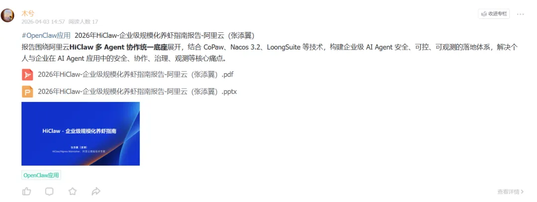报告围绕阿里云HiClaw 多 Agent 协作统一底座展开,结合 CoPaw、Nacos 3.2、LoongSuite 等技术,构建企业级 AI Agent 安全、可控、可观测的落地体系,解决个人与企业在 AI Agent 应用中的安全、协作、治理、观测等核心痛点。公号后台回复“9”,在AI大模型·领地知识星球查看~如欲查看完整版文件,请扫描下方二维码加入“AI大模型·领地”获取。说明:本文部分文字与图片资源来自于网络,分享此文是出于传递更多信息之目的,若有来源标注错误或侵犯了您的合法权益,请立即后台留言通知我们,情况属实,我们会第一时间予以删除,并同时向您表示歉意。AI大模型·资料·藏经阁