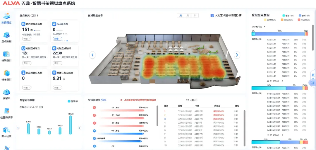 可视化界面展示馆内楼层、区域、架位、科目图书在架数量、区域人流量等关键数据,还支持错架、错序、顺架指引等功能,协助管理员快速处理日常管理工作。