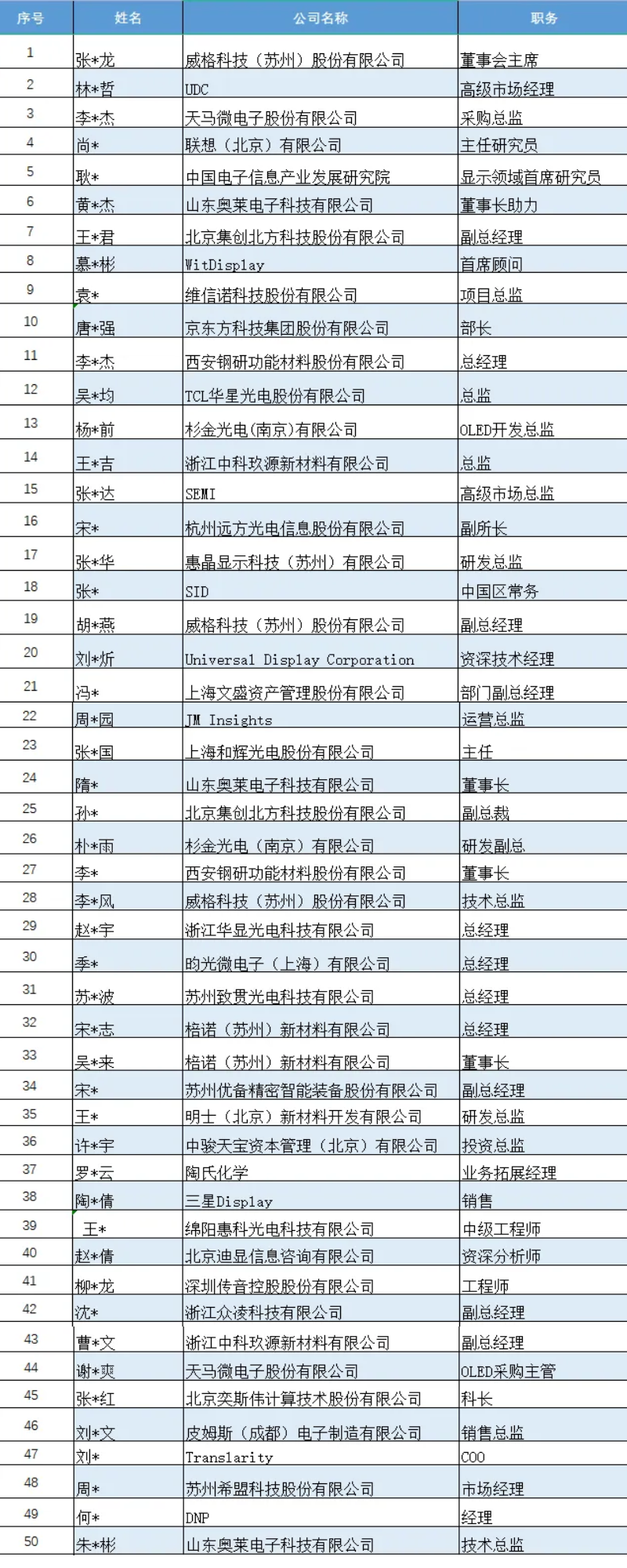 由中国光学光电子行业协会液晶分会、中国OLED产业联盟、SEMI主办,JMInsights、励程展览联合承办的“2023第九届中国OLED产业发展论坛(简称:CIOF)”将于8月30日在上海新国际博览中心M50会议室举办。组委会公布首批50位参会名单,如下: